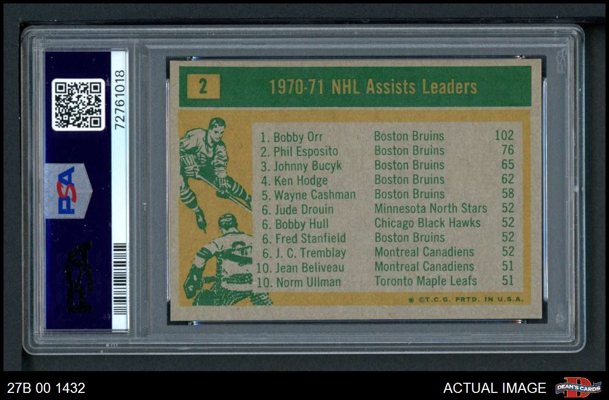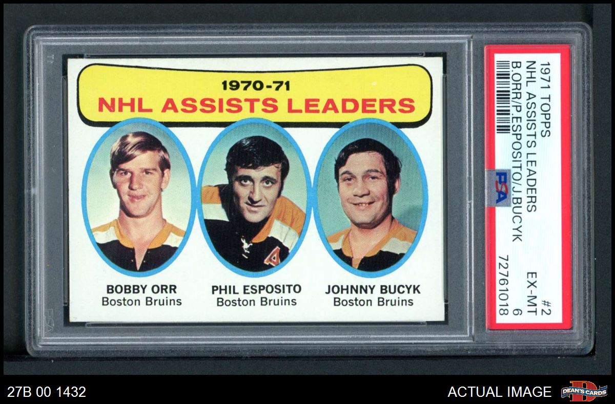 1971 Topps #2 - Bobby Orr / Phil Esposito / Johnny Bucyk Assists Leaders PSA 6 - EX/MT