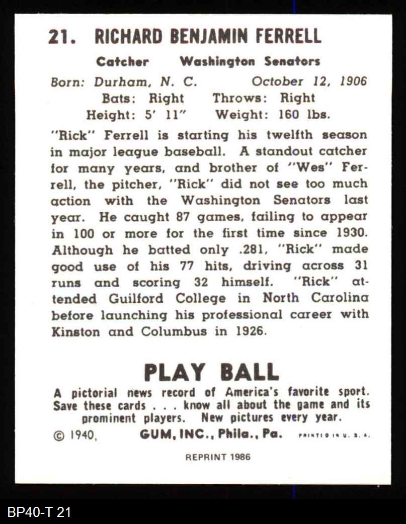1940 Play Ball Reprint #21 Rick Ferrell 8 - NM/MT