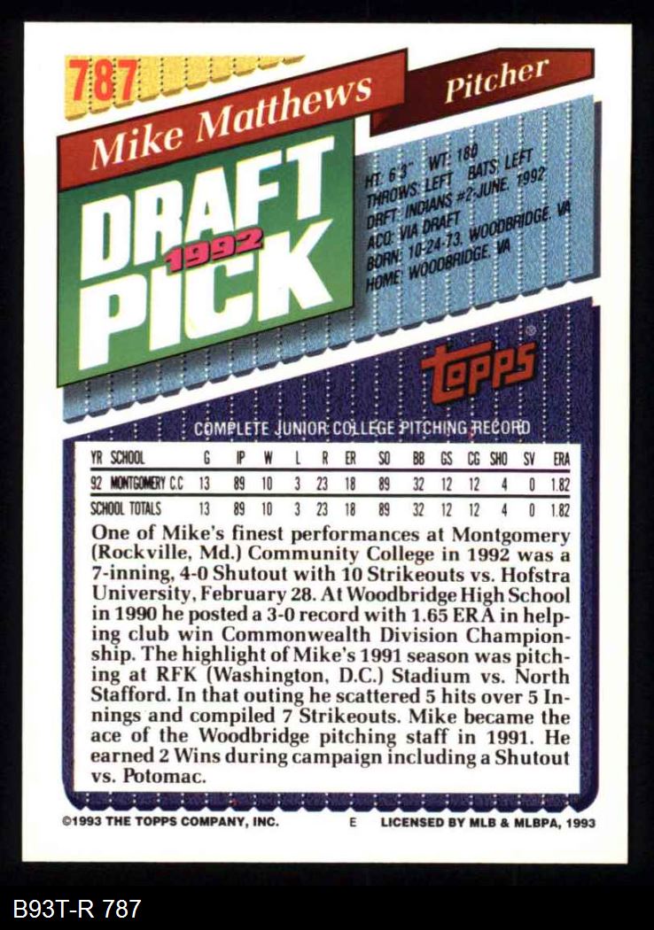 1993 Topps #787 Mike Matthews 8 - NM/MT