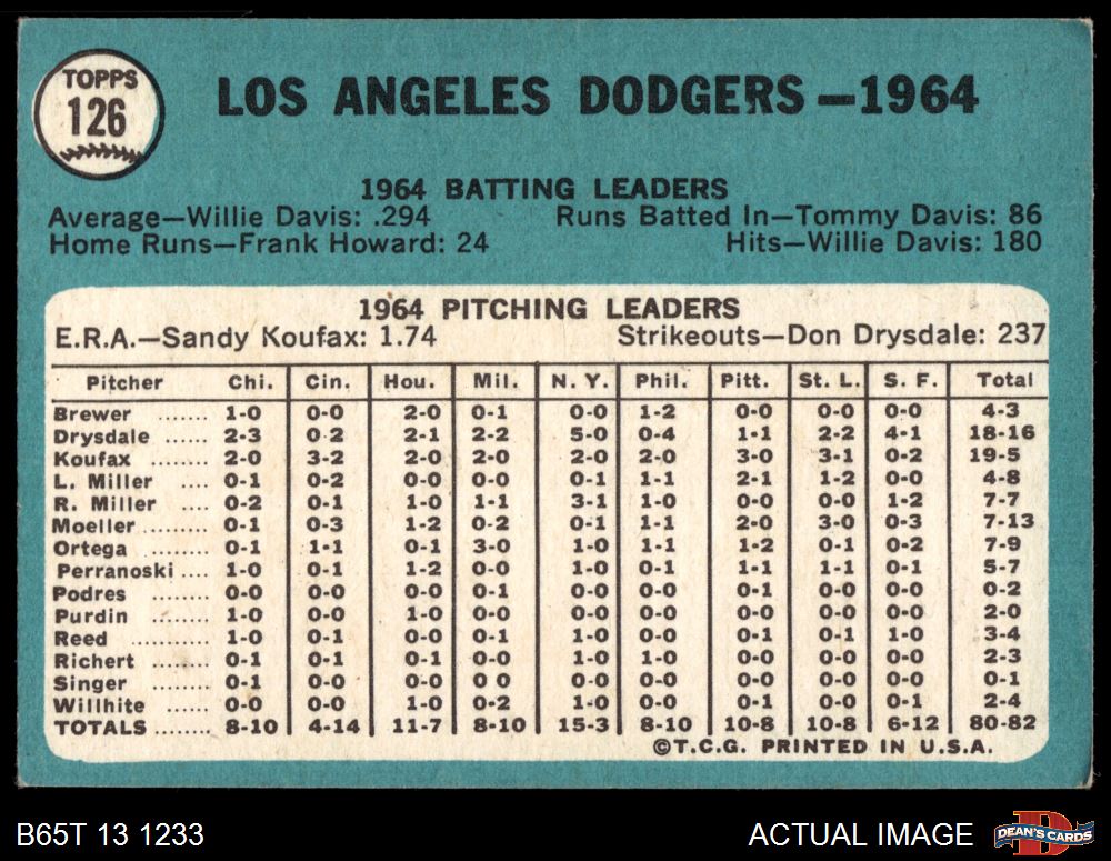 1965 Topps #126 Dodgers Team 3.5 - VG+