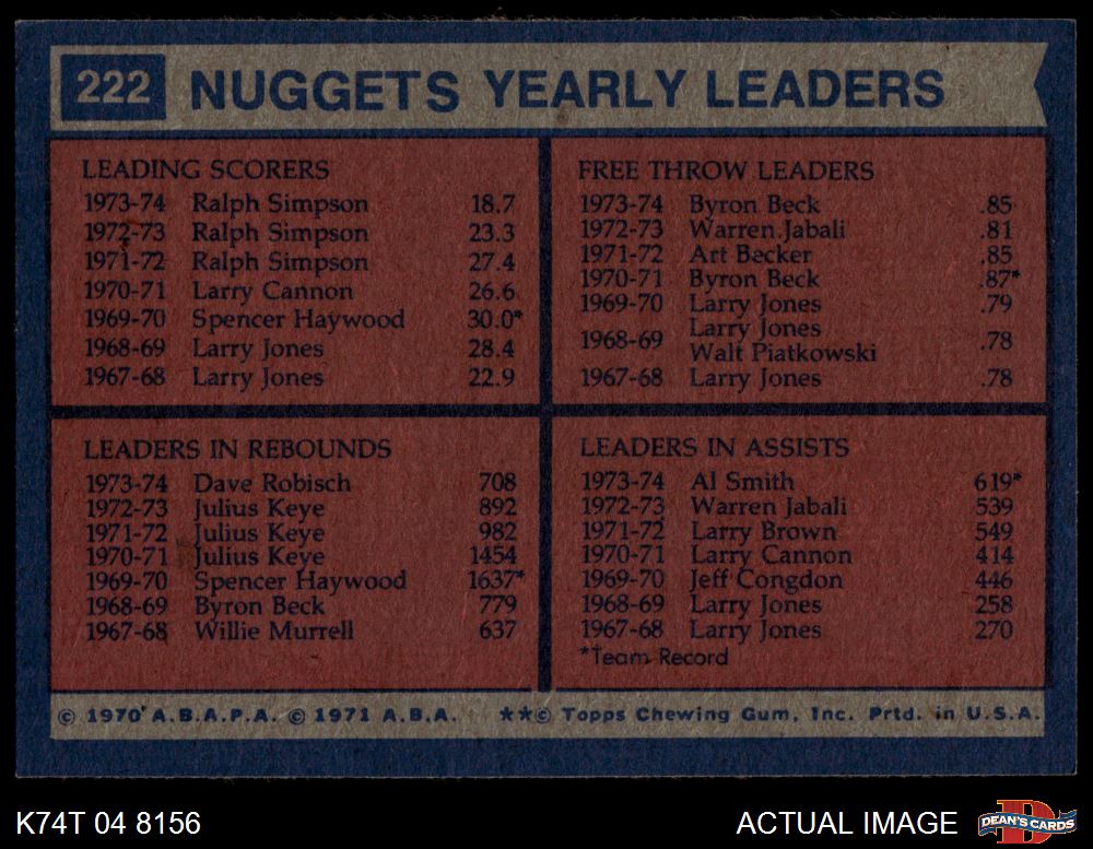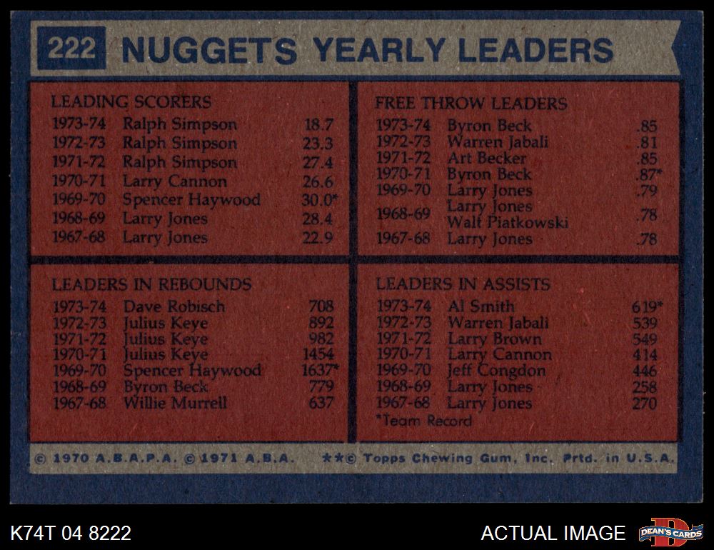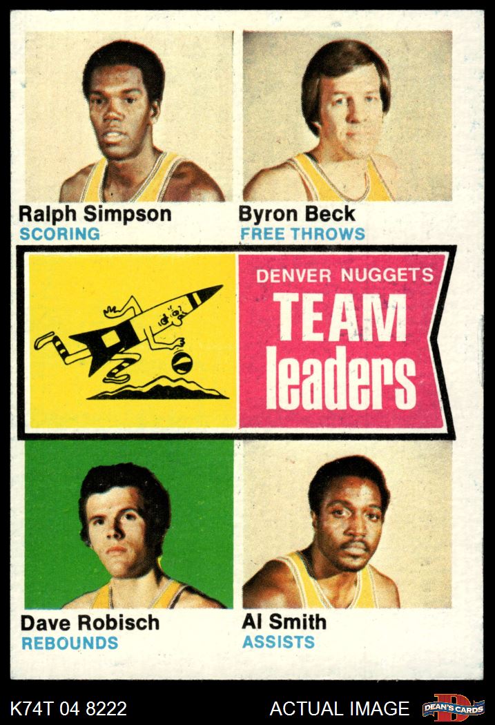 1974 Topps #222 - Al Smith / Dave Robisch / Byron Beck / Ralph Simpson Nuggets Leaders 4 - VG/EX