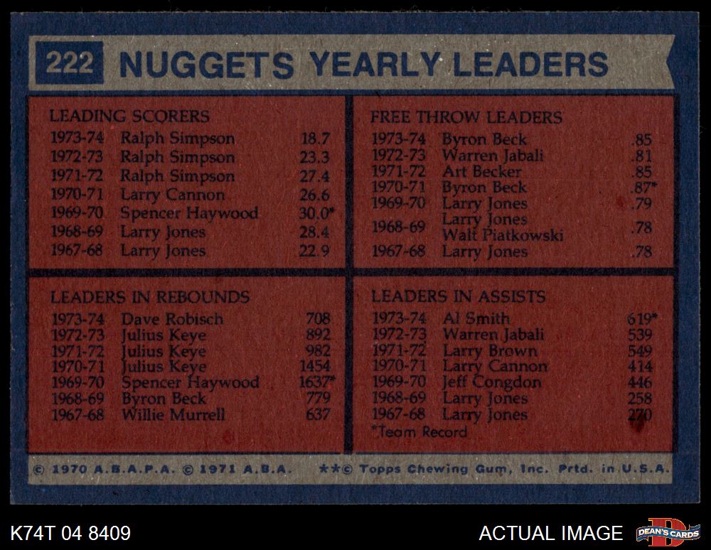 1974 Topps #222 - Al Smith / Dave Robisch / Byron Beck / Ralph Simpson Nuggets Leaders 8 - NM/MT