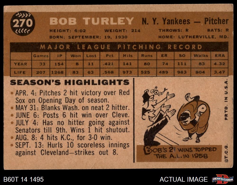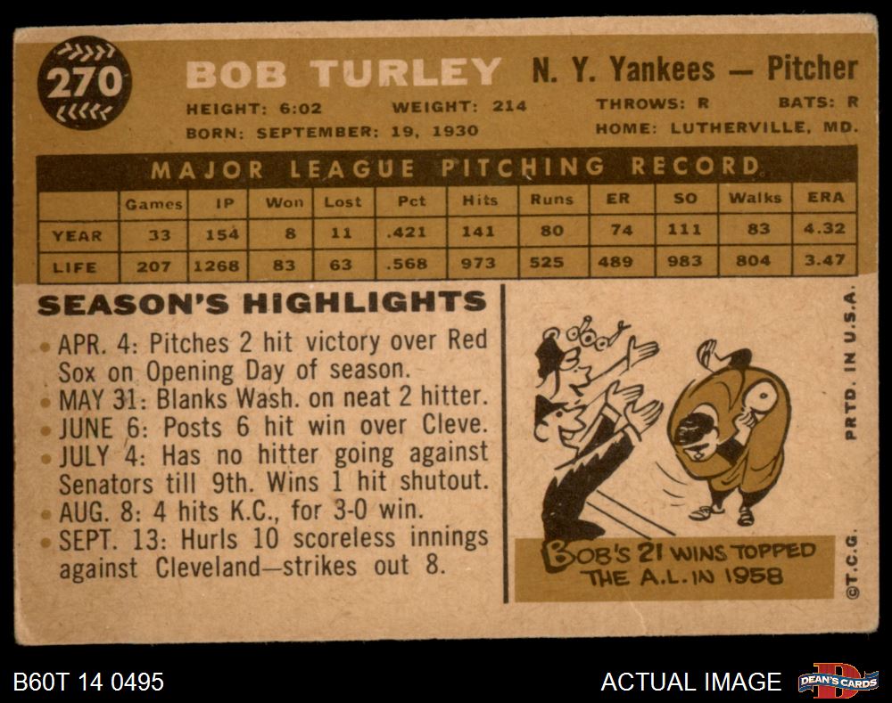 1960 Topps #270 Bob Turley 2 - GOOD