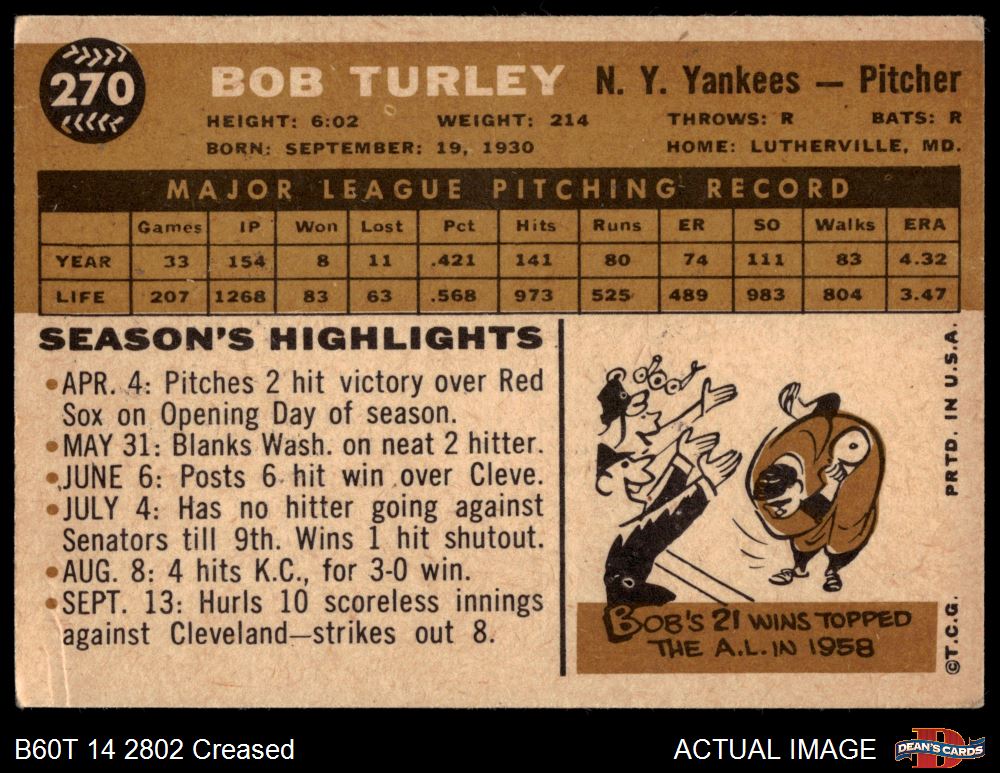 1960 Topps #270 Bob Turley 3.5 - VG+