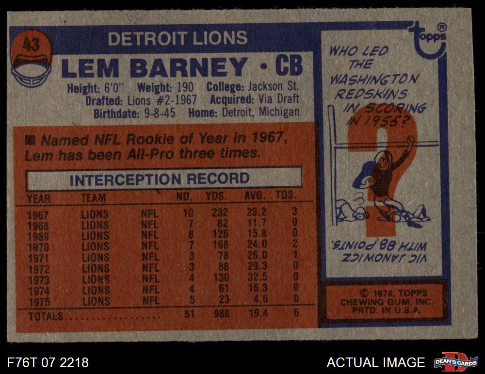 1976 Topps #43 Lem Barney 3 - VG