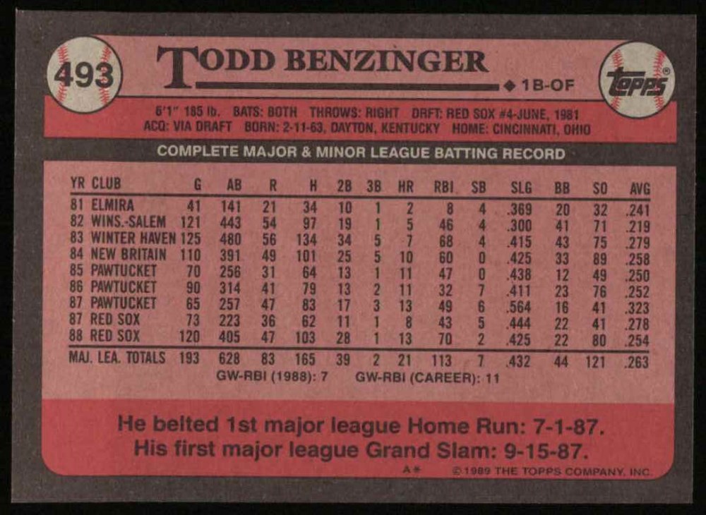 1989 Topps #493 Todd Benzinger 8 - NM/MT