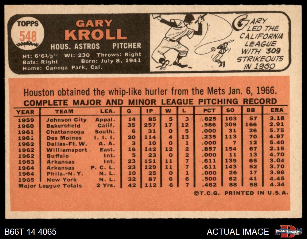 1966 Topps #548 Gary Kroll 5 - EX