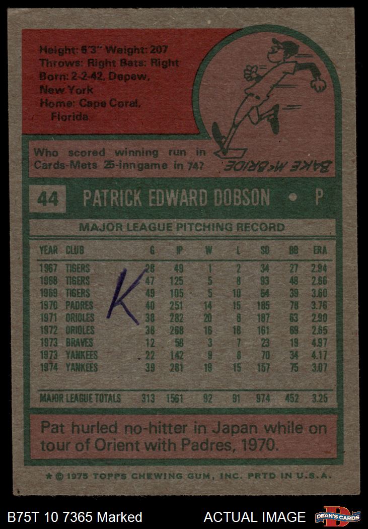 1975 Topps #44 Pat Dobson Front Thumbnail