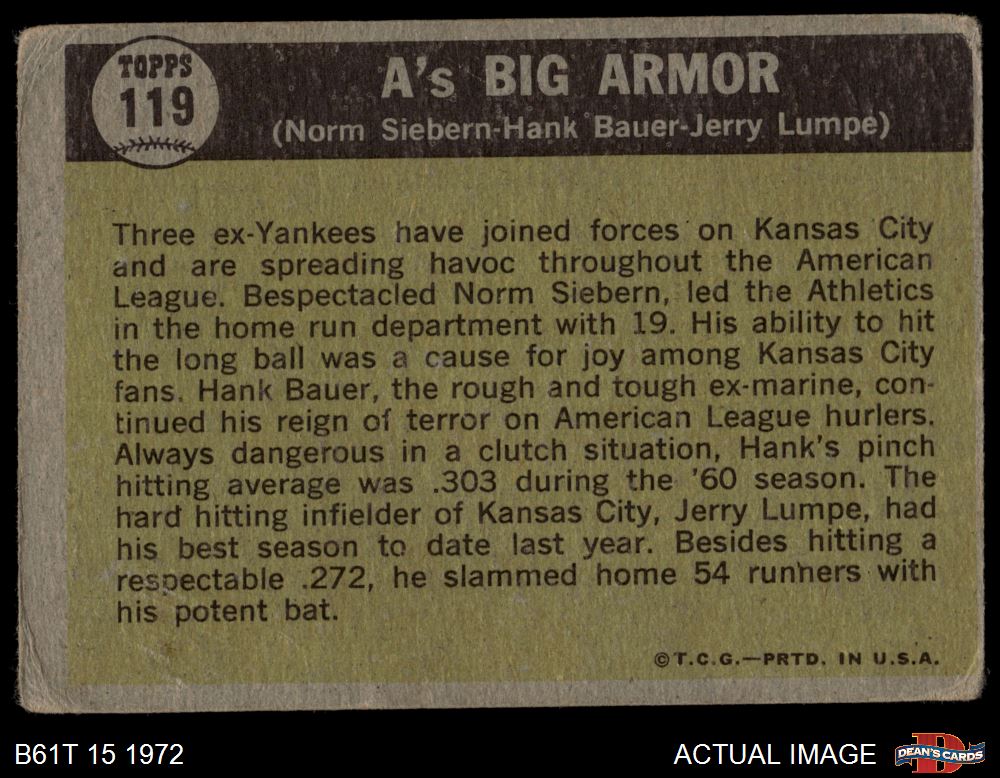 1961 Topps #119 - Norm Siebern / Hank Bauer / Jerry Lumpe A's Big Armor 1.5 - FAIR