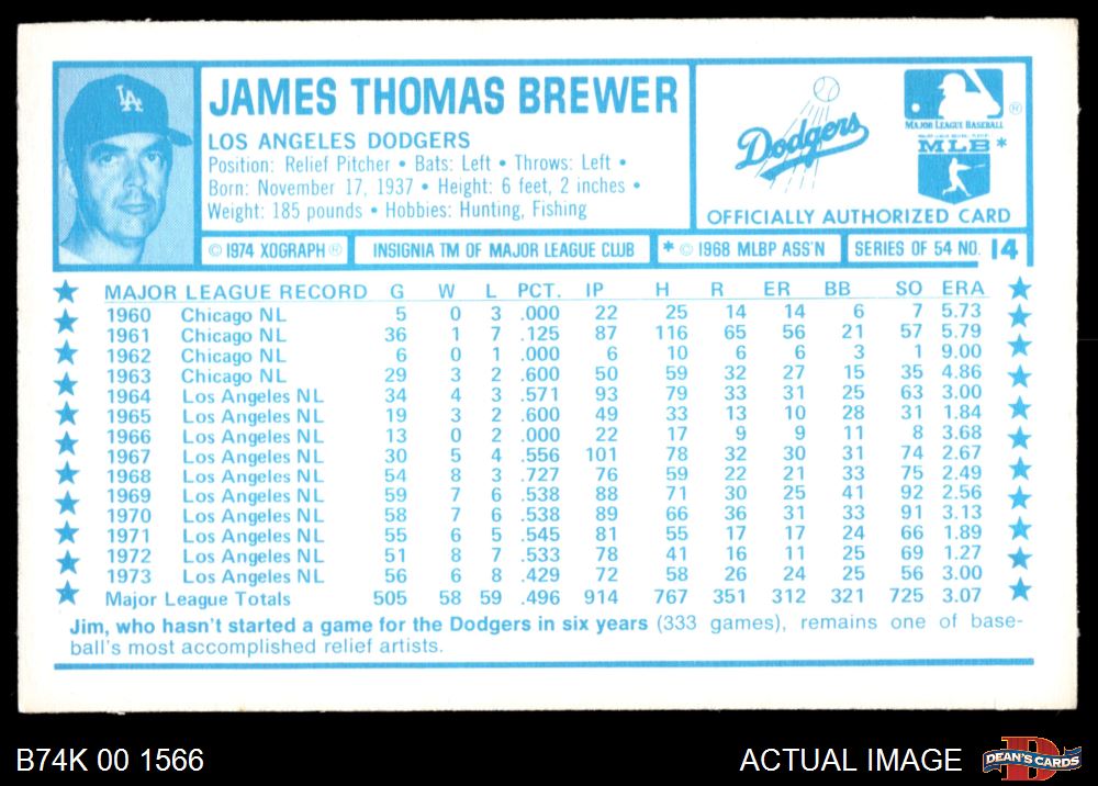1974 Kellogg's #14 Jim Brewer 2 - GOOD