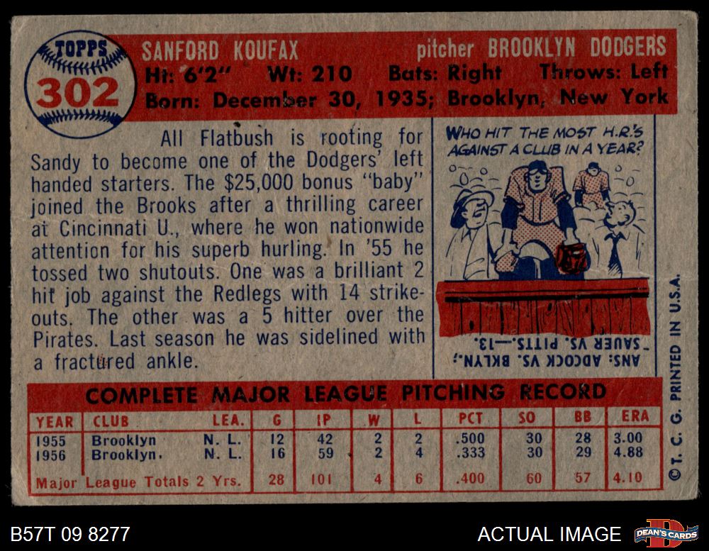1957 Topps #302 Sandy Koufax 1.5 - FAIR