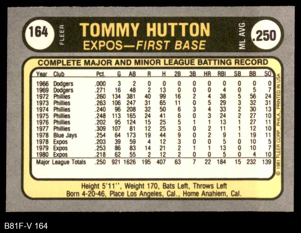 1981 Fleer #164 Tommy Hutton 8 - NM/MT