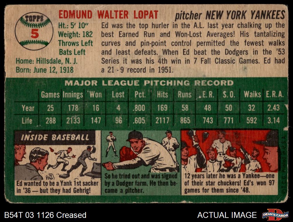 1954 Topps #5 WHT Eddie Lopat 1 - POOR