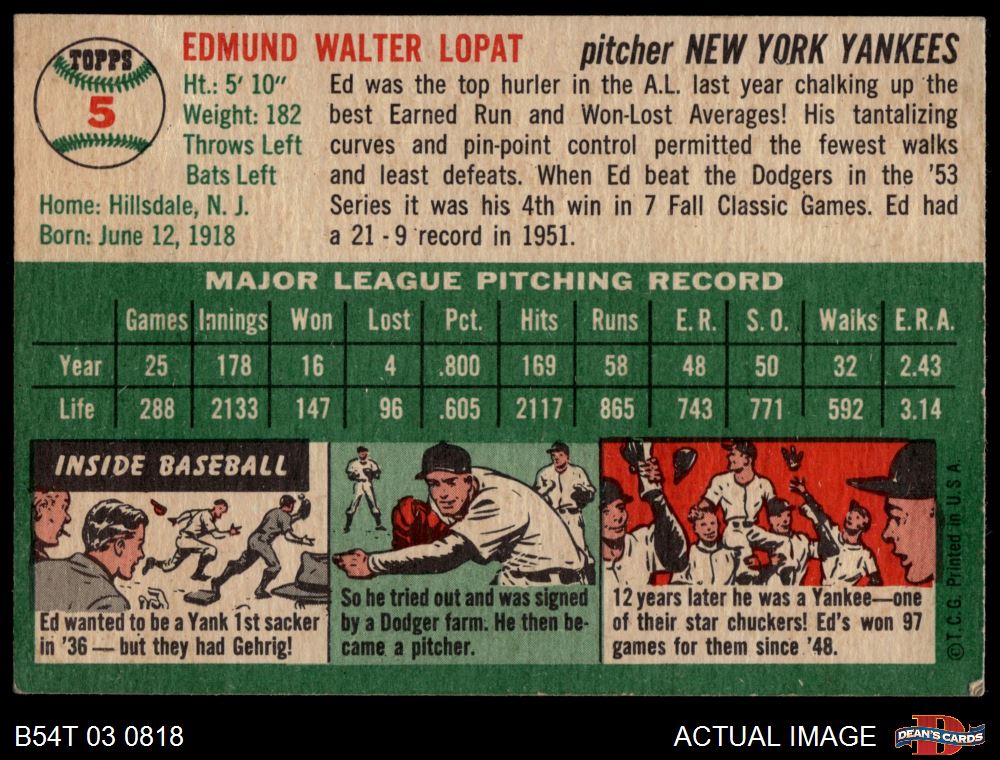 1954 Topps #5 WHT Eddie Lopat 6 - EX/MT