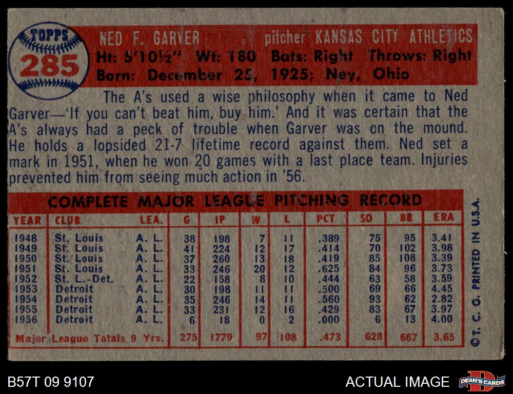 1957 Topps #285 Ned Garver Front Thumbnail
