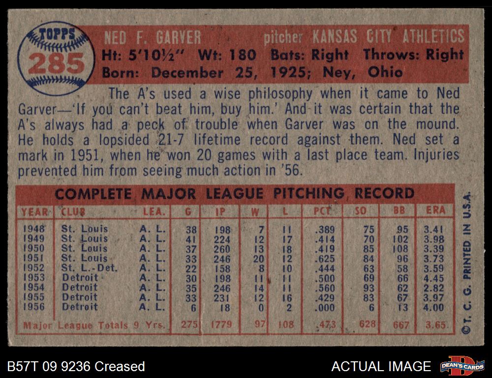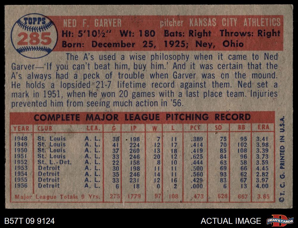 1957 Topps #285 Ned Garver 3 - VG