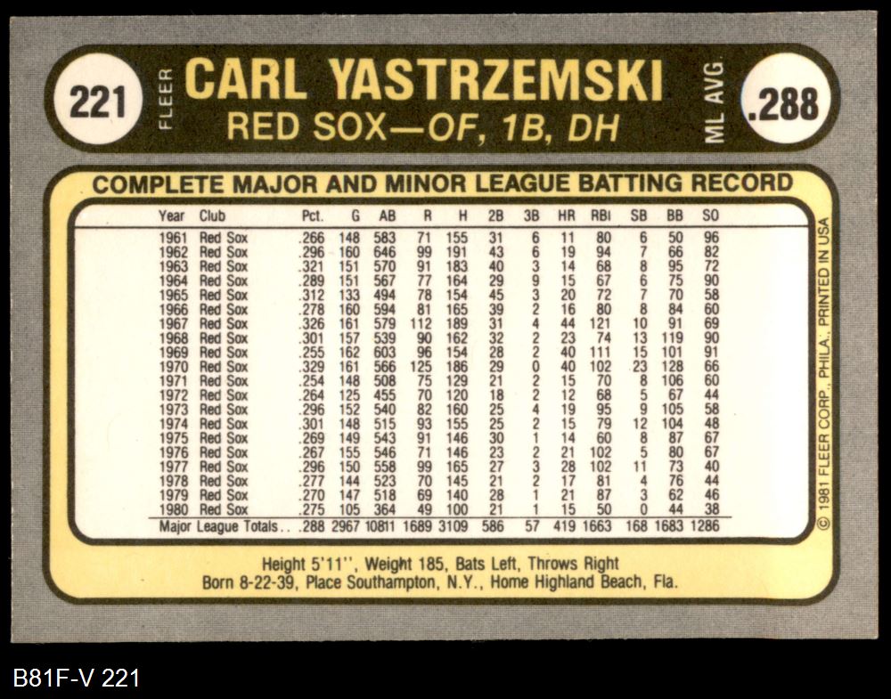 1981 Fleer #221 Carl Yastrzemski 8 - NM/MT