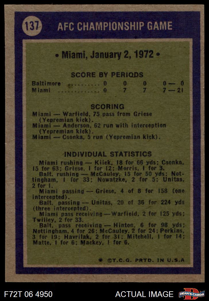 1972 Topps #137 Johnny Unitas / Manny Fernandez AFC Championship 7.5 - NM+