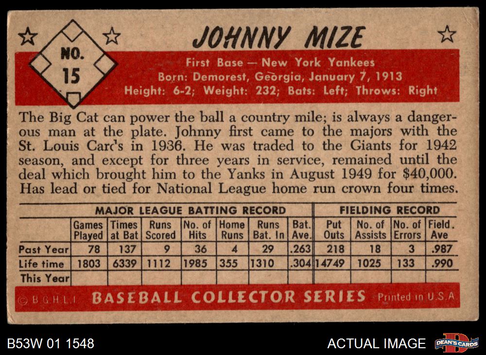 1953 Bowman B&W #15 Johnny Mize 4 - VG/EX