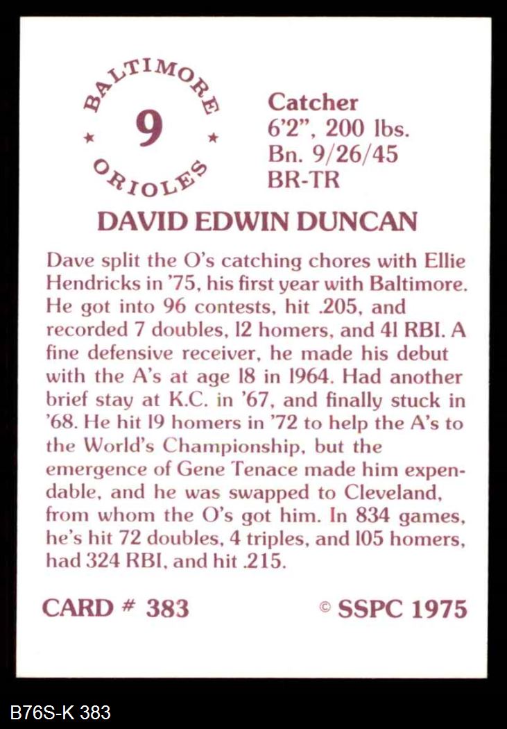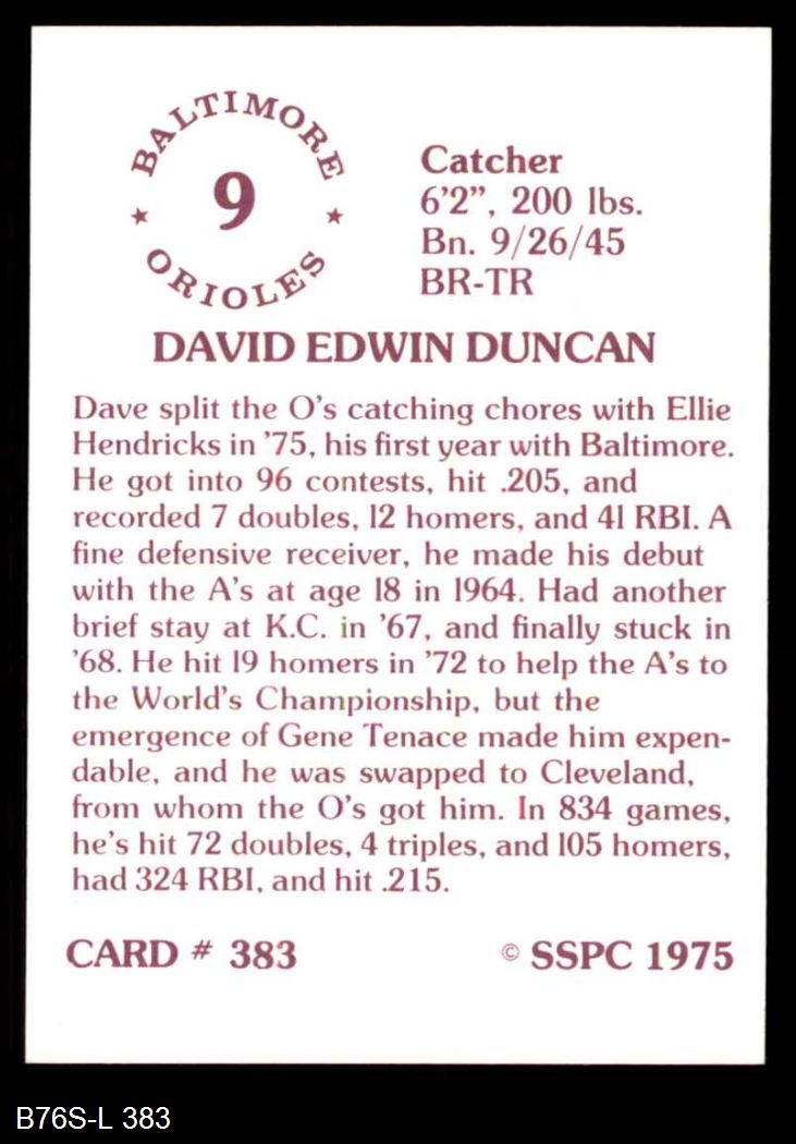 1975 SSPC #383 Dave Duncan 8 - NM/MT