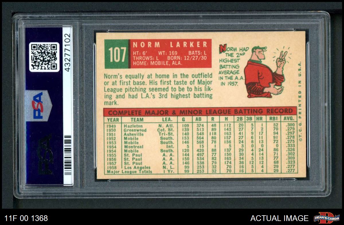 1959 Topps #107 Norm Larker PSA 8 - NM/MT