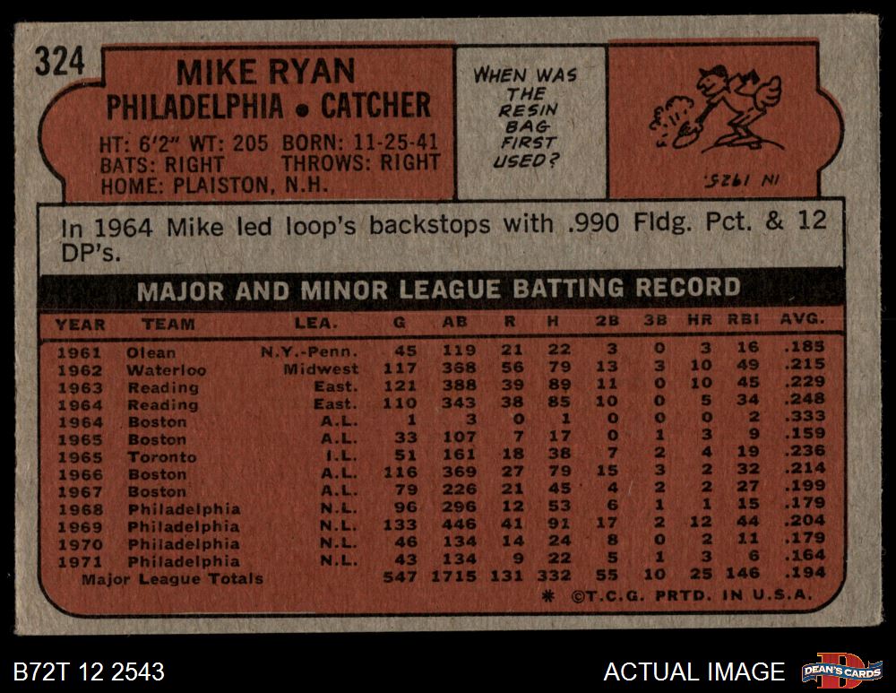 1972 Topps #324 Mike Ryan 2 - GOOD