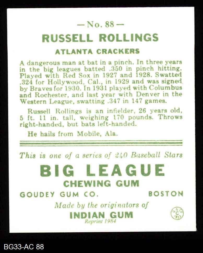1933 Goudey Reprint #88 Russell Rollings 8 - NM/MT