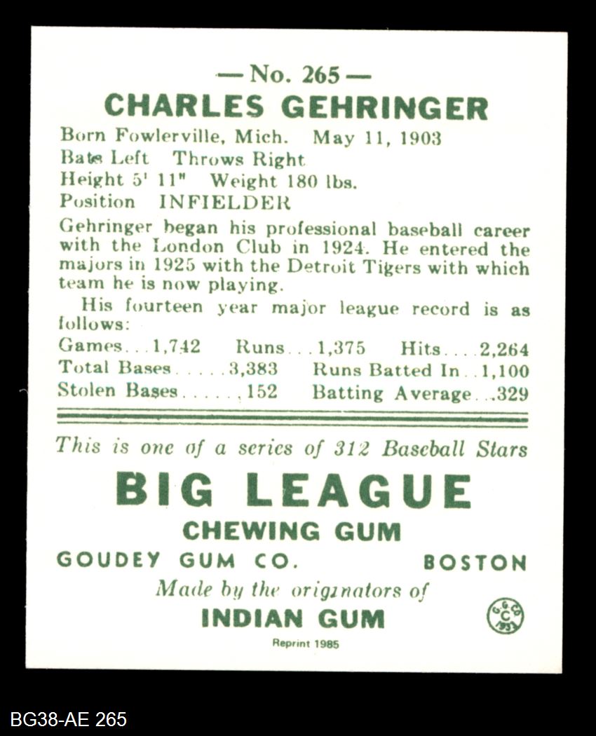 1938 Goudey Heads-Up Reprint #265 Charley Gehringer 8 - NM/MT