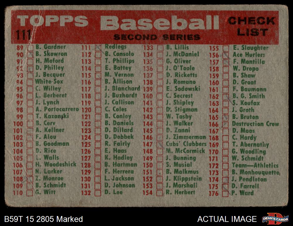 1959 Topps #111 Reds Team Checklist 1 - POOR