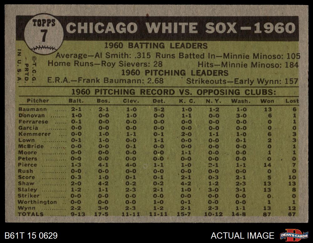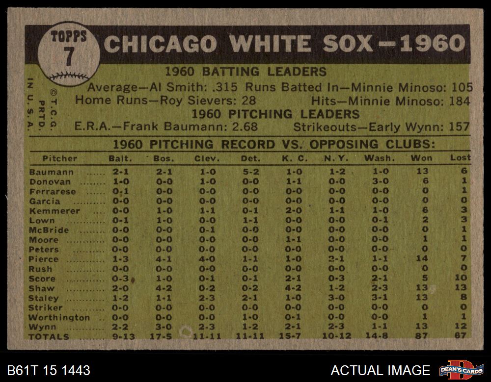1961 Topps #7 YEL White Sox Team 4 - VG/EX