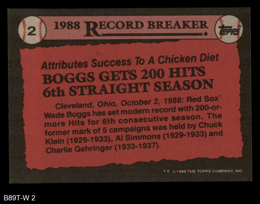 1989 Topps #2 - Wade Boggs Record Breaker 8 - NM/MT
