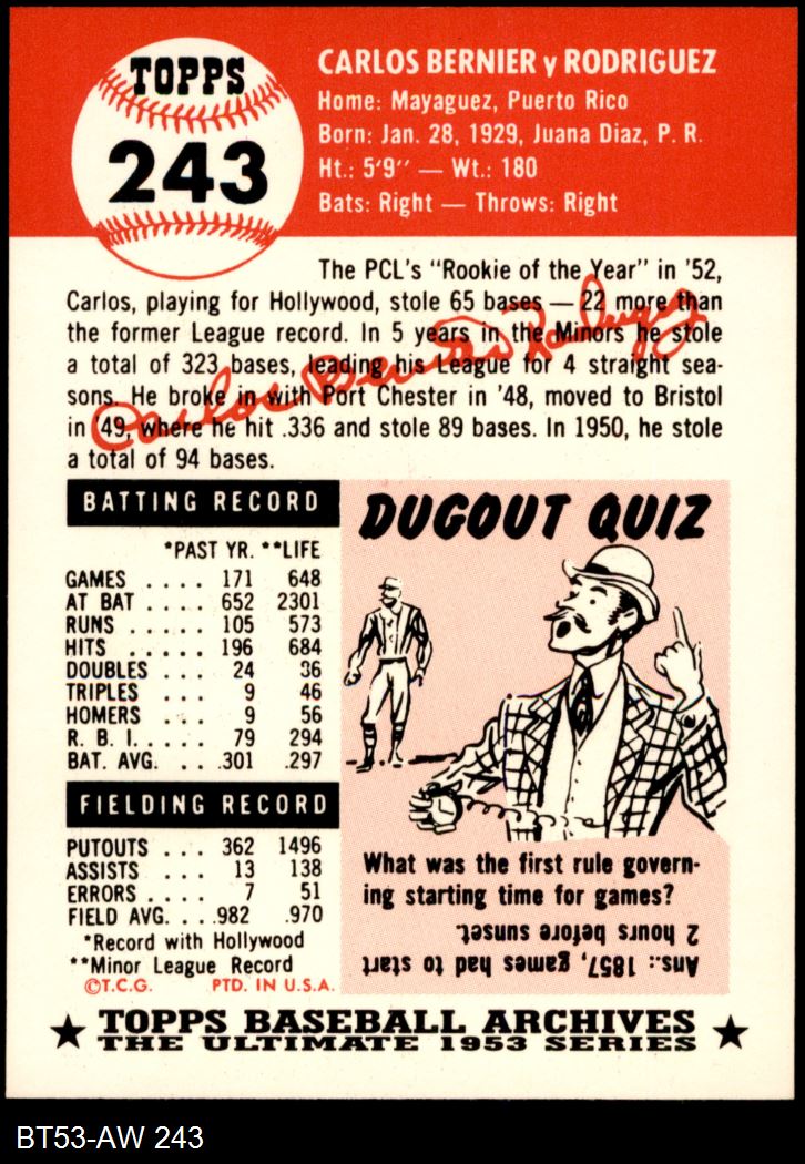 1953 Topps Archives #243 Carlos Bernier 8 - NM/MT