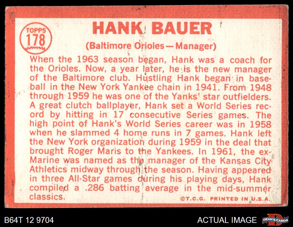 1964 Topps #178 Hank Bauer 3 - VG