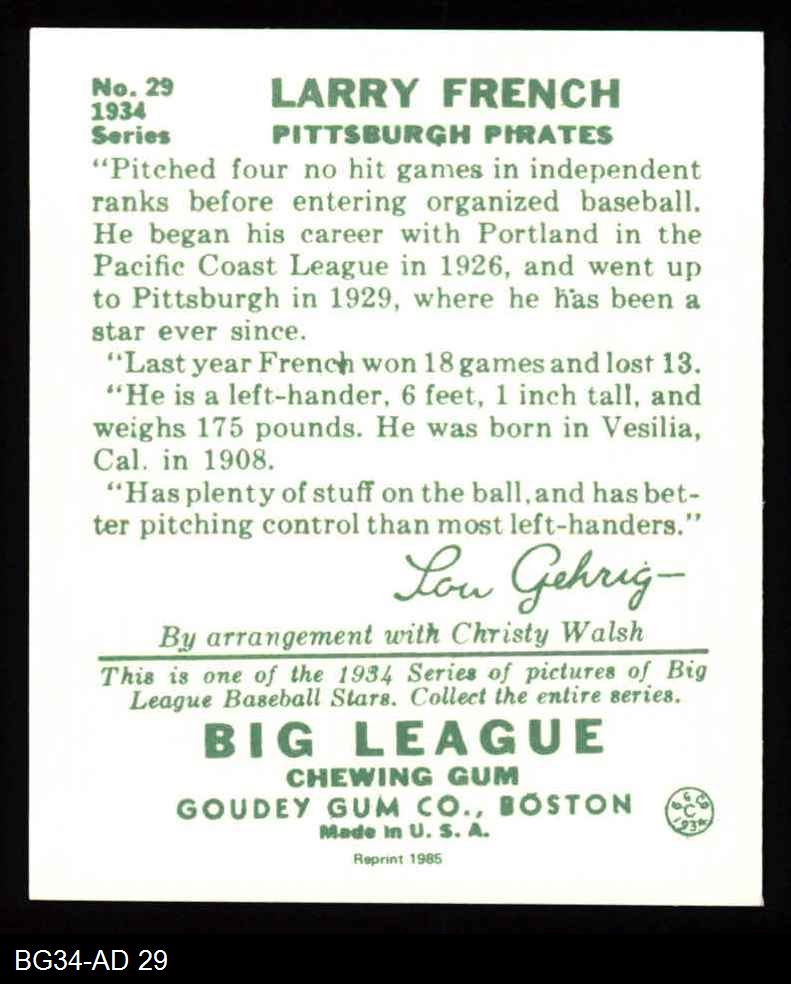 1934 Goudey Reprint #29 Larry French 8 - NM/MT