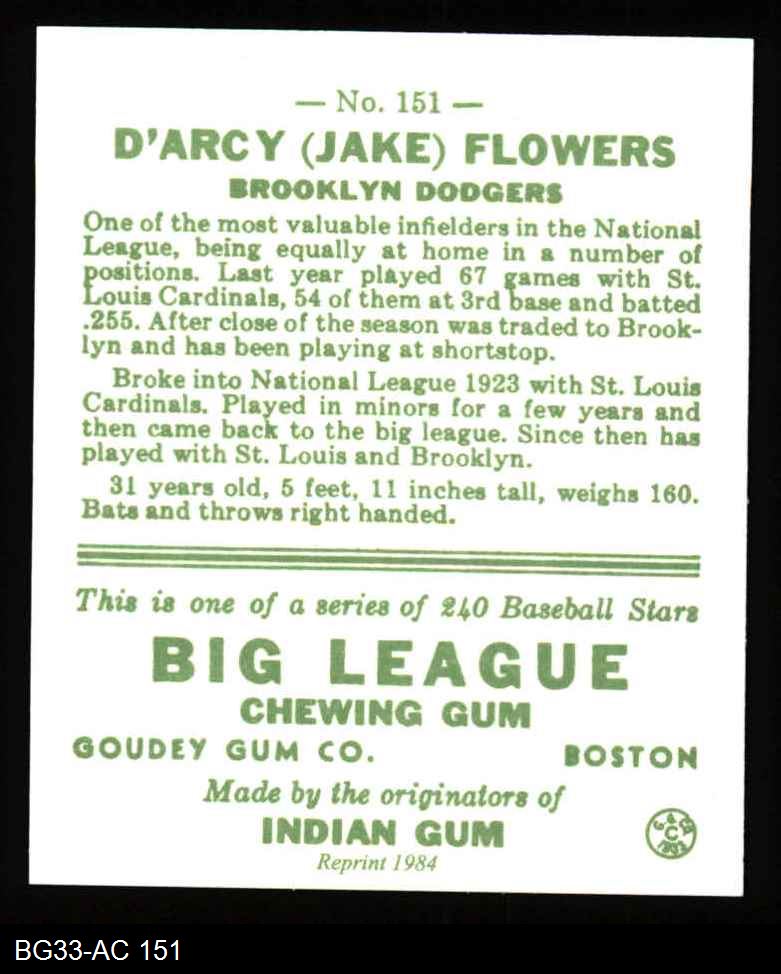 1933 Goudey Reprint #151 Jake Flowers