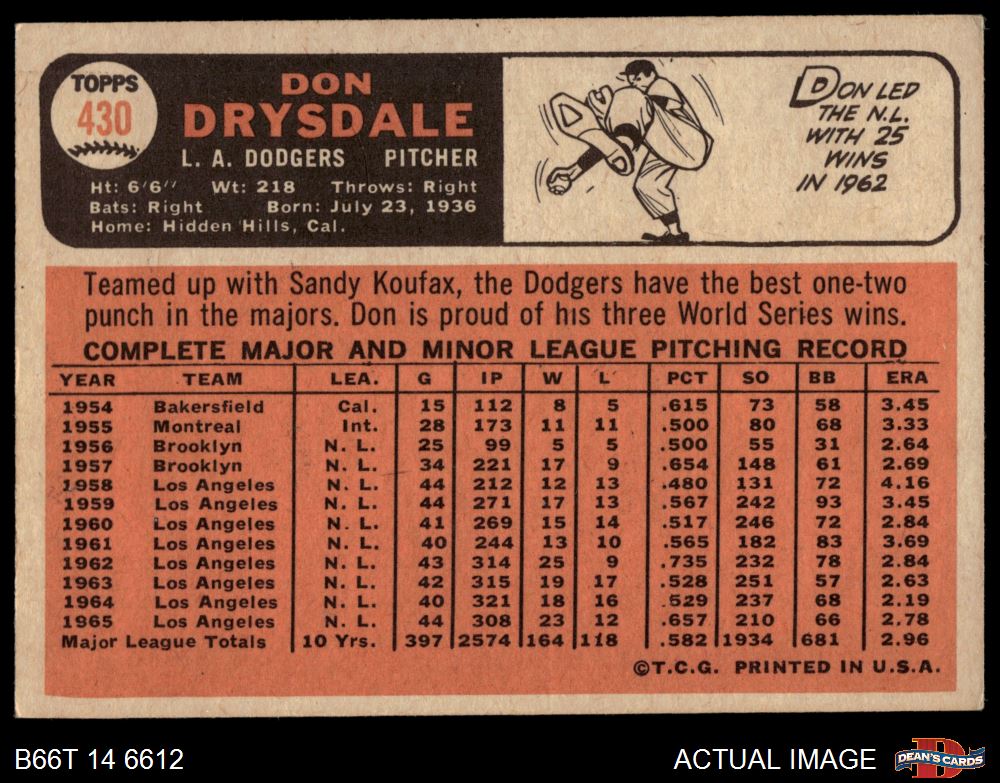 1966 Topps #430 Don Drysdale 4 - VG/EX
