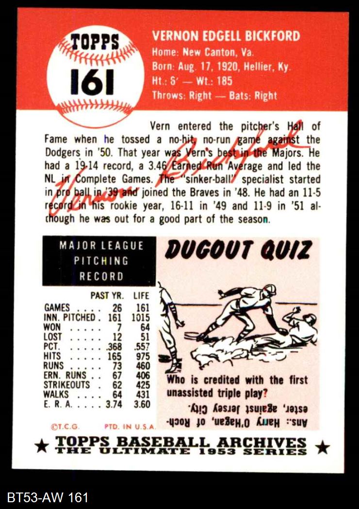 1953 Topps Archives #161 Vern Bickford 8 - NM/MT