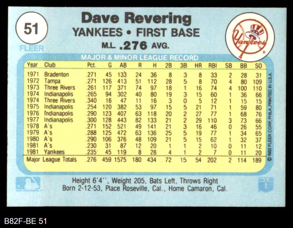 1982 Fleer #51 Dave Revering 8 - NM/MT