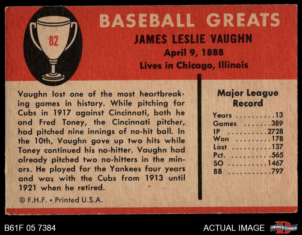 1961 Fleer #82 Hippo Vaughn 3.5 - VG+
