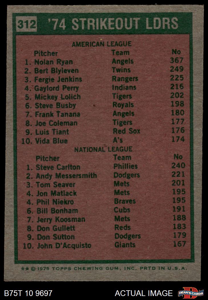 1975 Topps #312 - Nolan Ryan / Steve Carlton Strikeout Leaders 4 - VG/EX