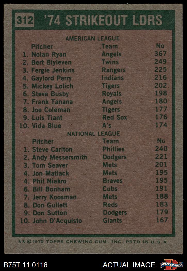 1975 Topps #312 - Nolan Ryan / Steve Carlton Strikeout Leaders 6.5 - EX/MT+