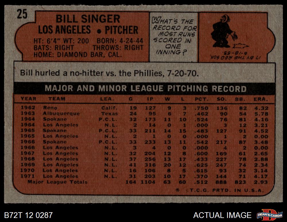1972 Topps #25 Bill Singer 4.5 - VG/EX+