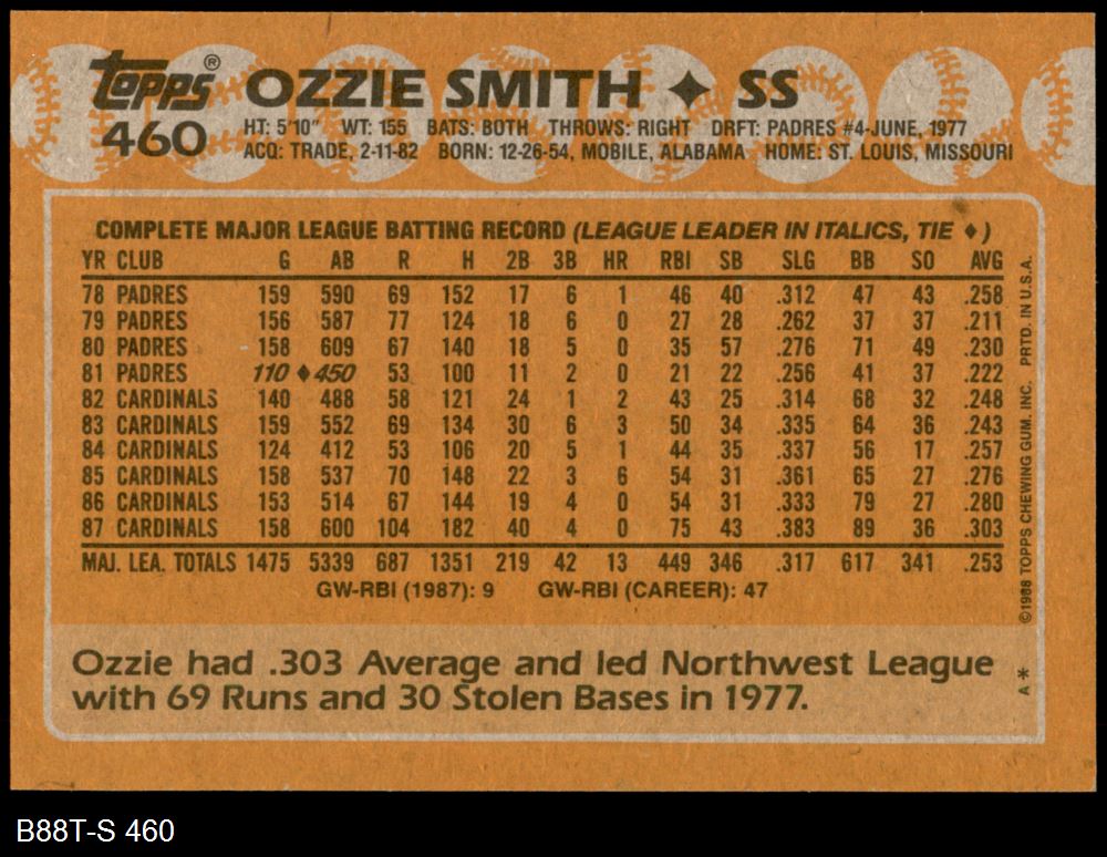 1988 Topps #460 Ozzie Smith 8 - NM/MT