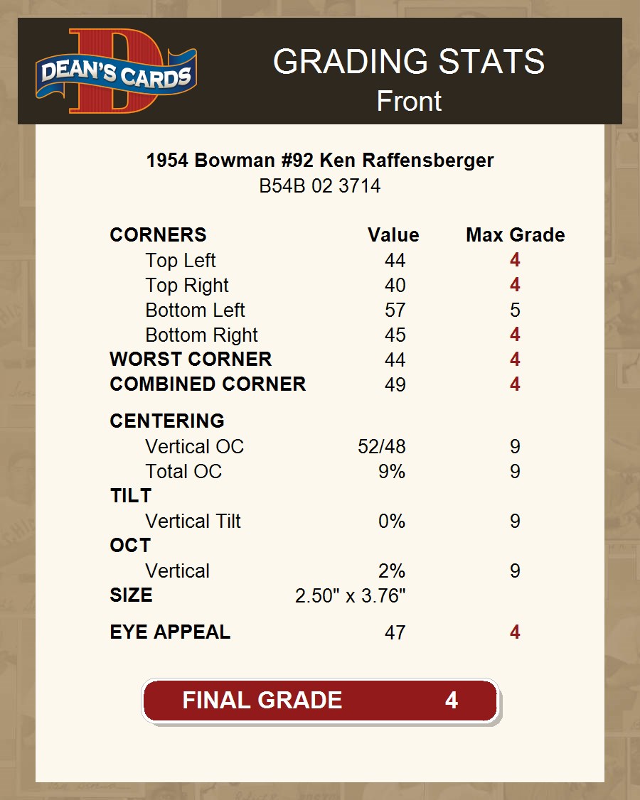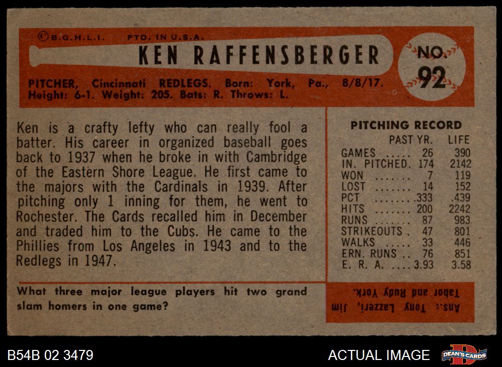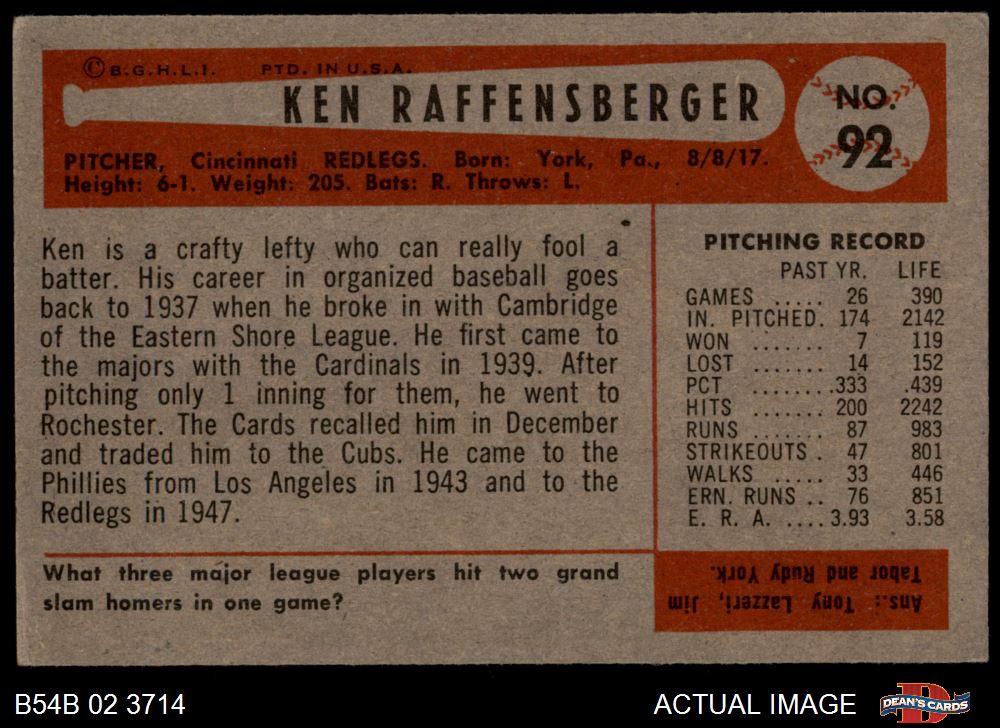 1954 Bowman #92 Ken Raffensberger 4 - VG/EX