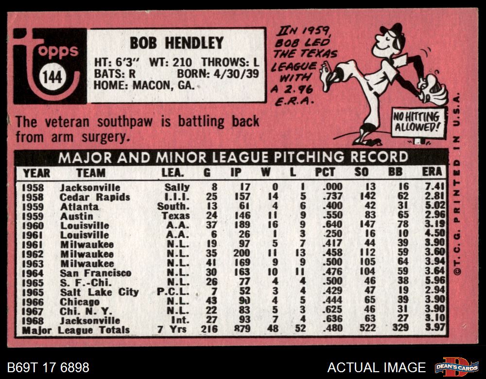 1969 Topps #144 Bob Hendley
