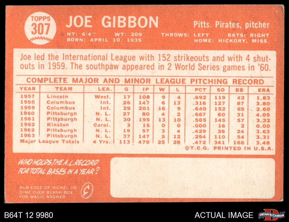 1964 Topps #307 Joe Gibbon 2 - GOOD