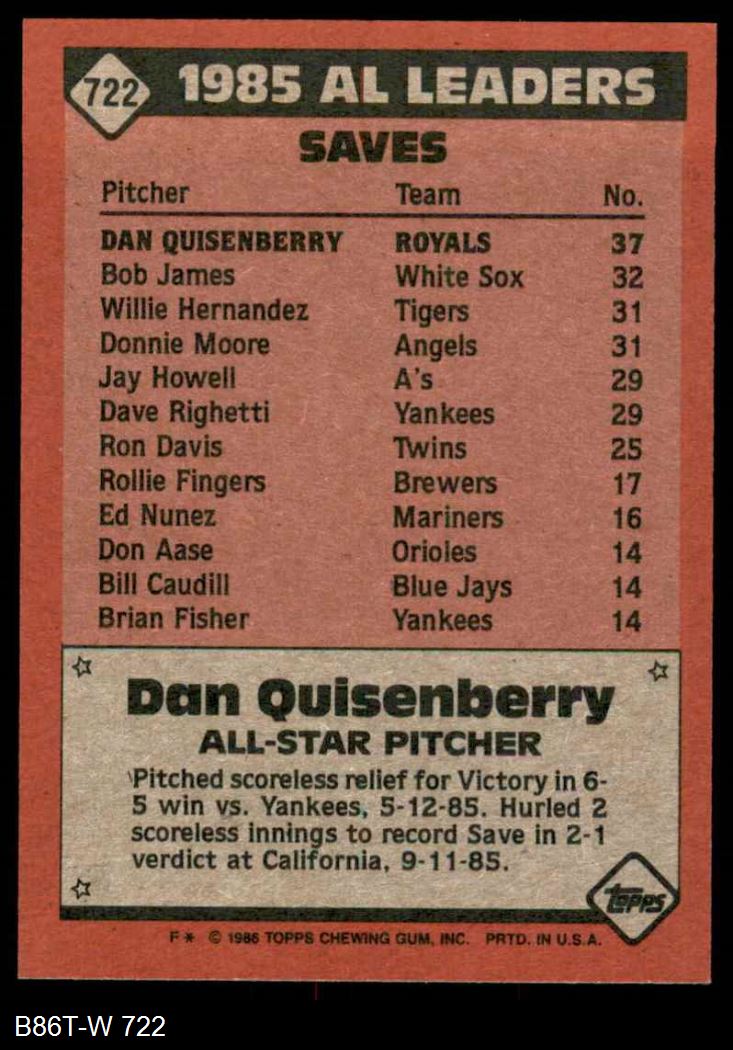 1986 Topps #722 - Dan Quisenberry All-Star 8 - NM/MT