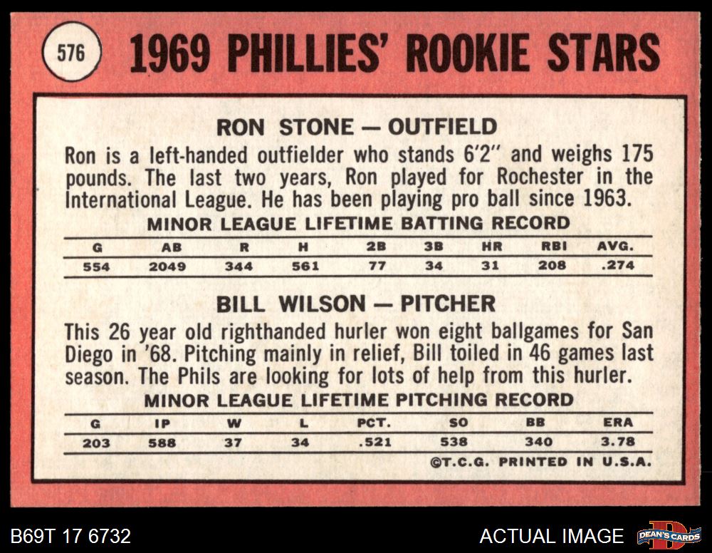 1969 Topps #576 - Ron Stone / Bill Wilson Phillies Rookies 7 - NM