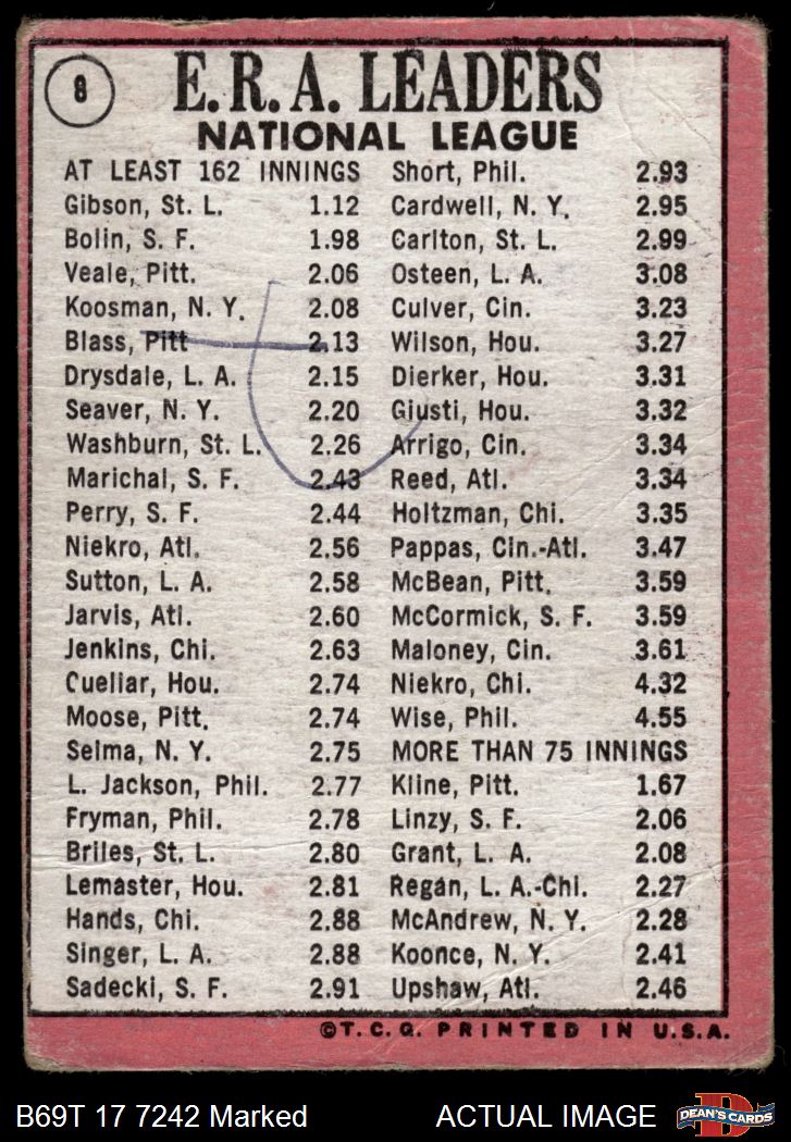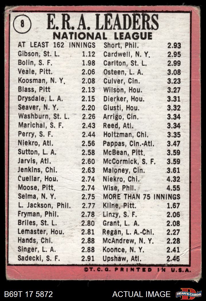 1969 Topps #8 - Bob Gibson / Bobby Bolin / Bob Veale NL ERA Leaders 1 - POOR