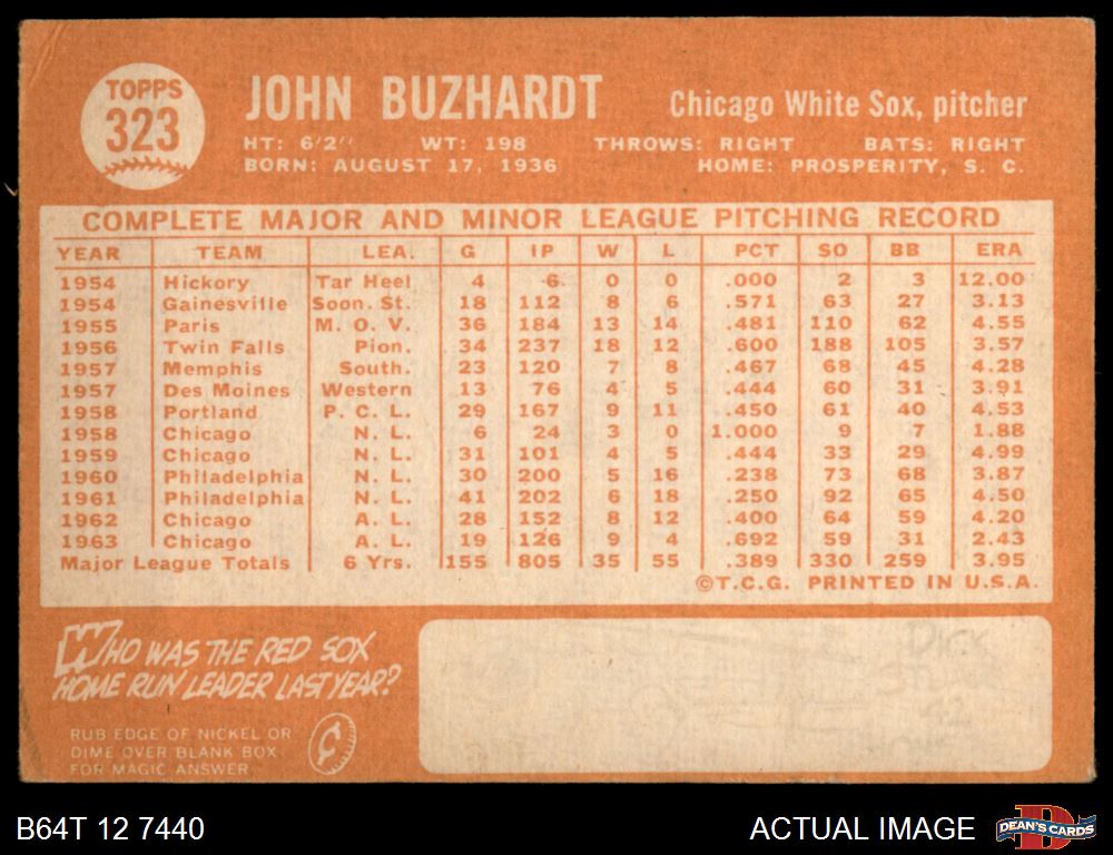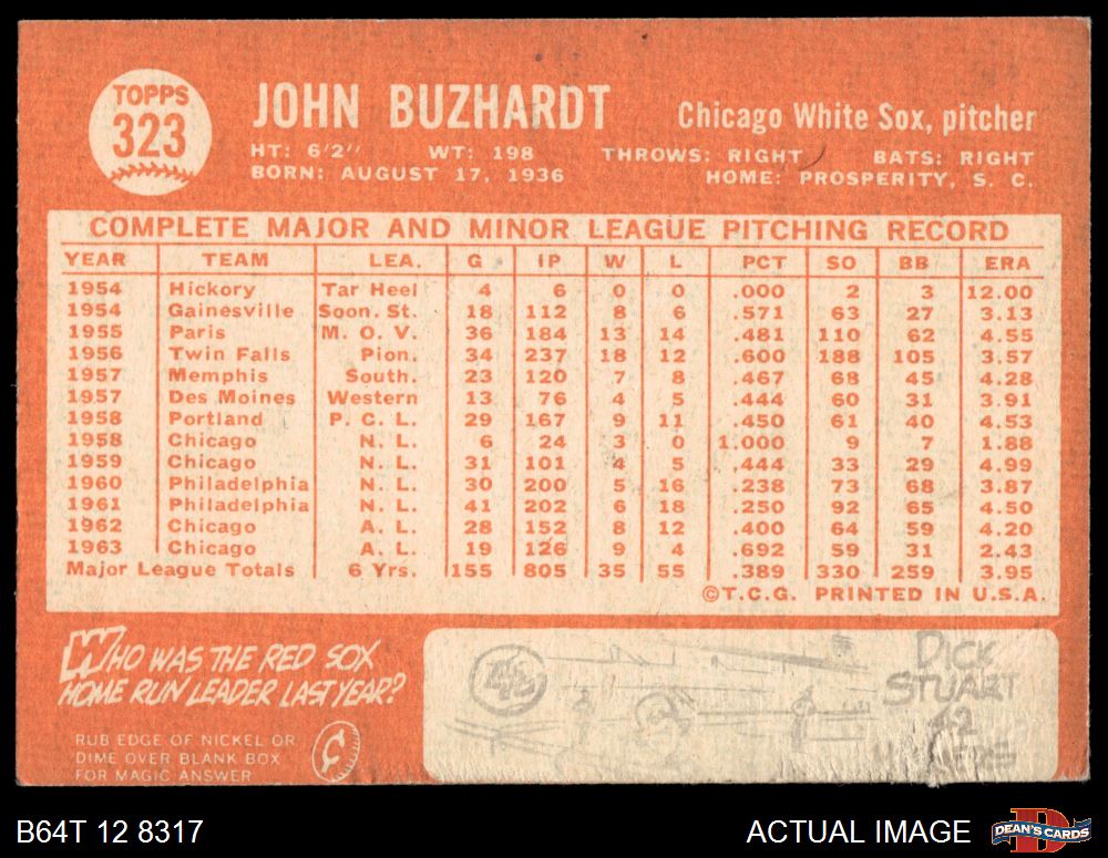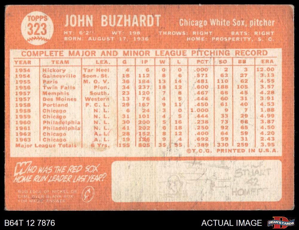 1964 Topps #323 John Buzhardt 2 - GOOD
